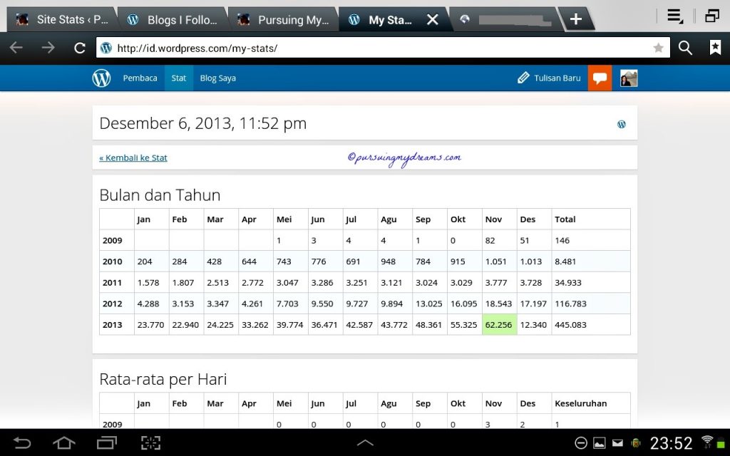 Rata-rata viewer tahun 2009 cuma satu kunjungan, tahun 2010 rata-rata 23 kunjungan, tahun 2011 rata-rata 96, tahun 2012 rata-ratanya 319 dan tahun 2013 ini berhubung belum akhir tahun sementara diangka rata-rata 915.
