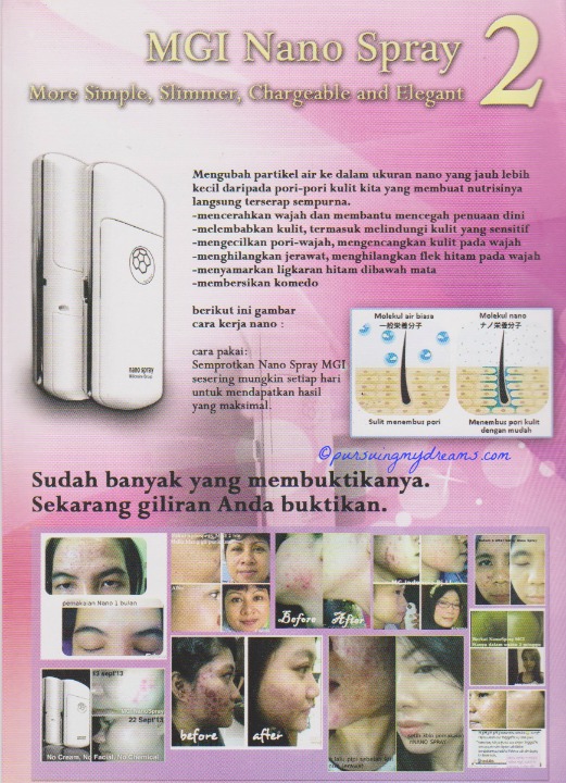 Nano Spray adalahsebuah alat revolusioner dari negara Jepang yang di buat khusus untuk mengatasi semua masalah kulit terutama pada bagian wajah. Tidak mengandung efek samping karena bahan dasar yang sangat alami yaitu air. Kabar baik bagi anda semua yang selama ini sudah kapok dengan obat dokter atau cream wajah lain yang tidak ada hasilnya, karena Nano Spray ini sudah terdaftar pada Dinas Kesehatan No.YF.05.05/299/2013.