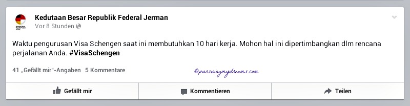 Oh ya beberapa hari lalu saya baca ketentuan baru pengurusan visa schengen. Awalnya hanya butuh 3 hari kerja, mulai akhir Juni 2014 untuk pengurusan visa schengen membutuhkan waktu 10 hari kerja. Entahlah hanya berlaku di kedutaan Jerman atau juga di kedutaan negara lain. Untuk musim panas begini jadwal bikin janji (online) padat sekali, jadi yang mau urus visa usahakan urus jauh-jauh hari.