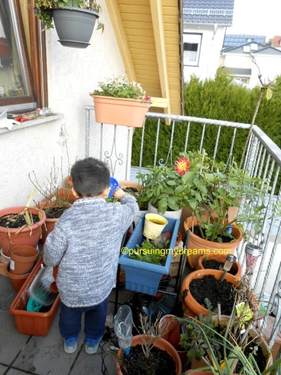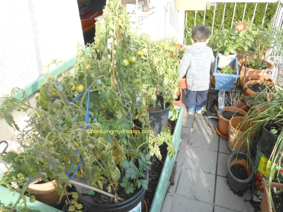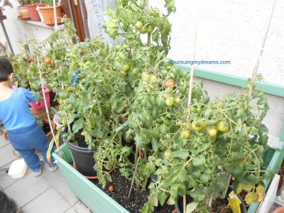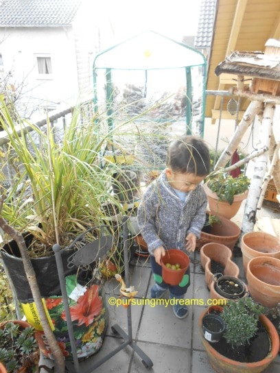 Benjamin senang sekali kalau saya bolehin ke balkon karena bisa berantakin kebun saya haha 😆 . Kalau mau bongkar kebun di musim gugur atau akhir musim semi bolehlah Benjamin ke balkon, saya biarkan dia berantakin kebun saya karena memang pas mau bongkar-bongkaran kan 🙂 . Berikut ini video kita panen tomat waktu bulan Oktober, saat itu belum tertalu dingin makanya kita belum pakai jaket pas dibalkon.