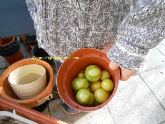 Bulan November ini kita panen tomat terakhir kali. Cuacanya sudah tidak mendukung lagi (dingin), walau tanaman tomat-tomat tersebut saya tutupi plastik supaya tidak kena hujan dan angin tetap saja tidak mungkin tomat-tomat tersebut akan menjadi merah sempurna karena matahari sudah jarang bersinar, lebih banyak mendung dan hujan setiap harinya.