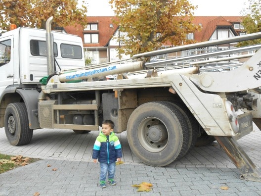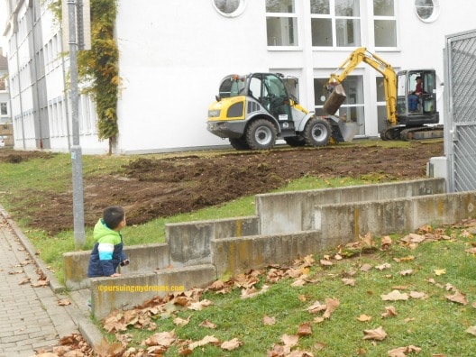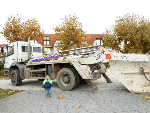 Benjamin suka sekali melihat mobil, bus dan berbagai kendaraan lainnya. Dirumah dia punya banyak mobil-mobilan dengan aneka bentuk. Saat melihat aslinya mobil besar tidak ada takutnya si bocah, malah mau didekati. Kalau yang sedang berhenti ya tidak masalah di pegang atau berdiri dekat mobil besarnya, kalau yang truk pengeruknya sedang beroperasi ya tidak boleh dong didekati. Ada garis polisi disekeliling lokasi yang sedang dikerjakan.