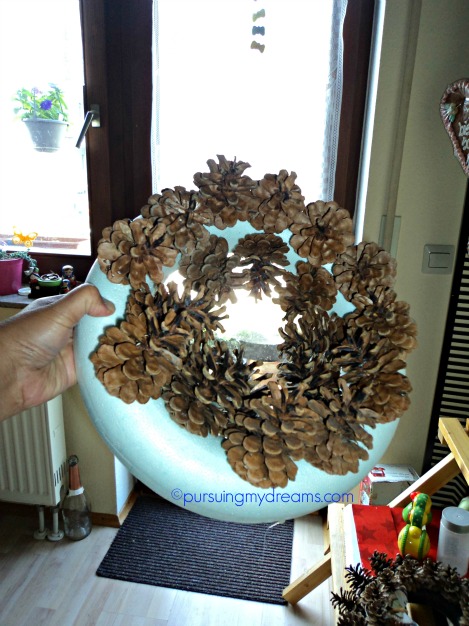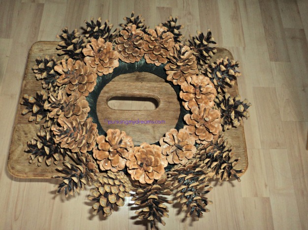 • Tempelkan buah pohon pinus (Pine Cone) satu persatu sampai wreath styrofoam penuh.