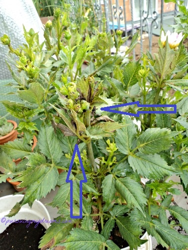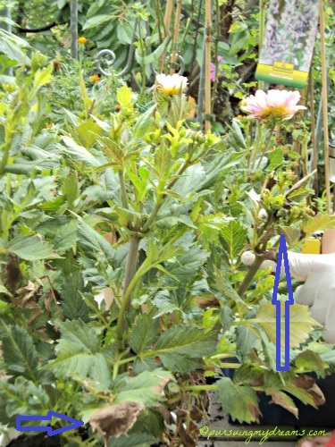 • Jika daun dahlia terlalu rimbun sulit menyiramnya. Jadi bagian bawah dekat tanahnya saya pangkas, supaya alat penyiram air mudah masuk hingga ke bagian tengah pot.