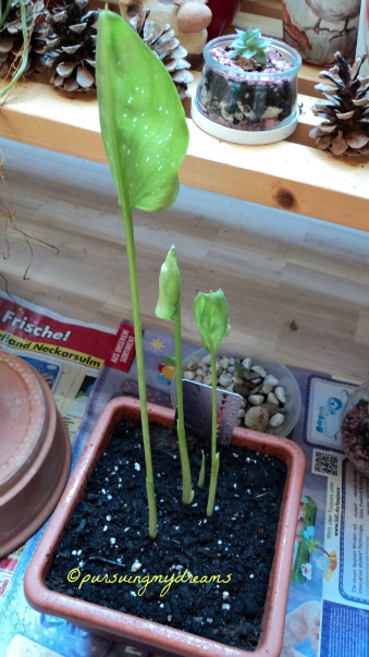 Umbinya (4 buah) saya tanam pada 2 Maret 2013. Umbinya direndam dulu 24 jam sebelum penanaman. Selama belum tumbuh, cukup siram seminggu sekali, atau kalau tanahnya benar-benar kering. Penyiraman berlebihan, akan menyebabkan umbinya busuk.
