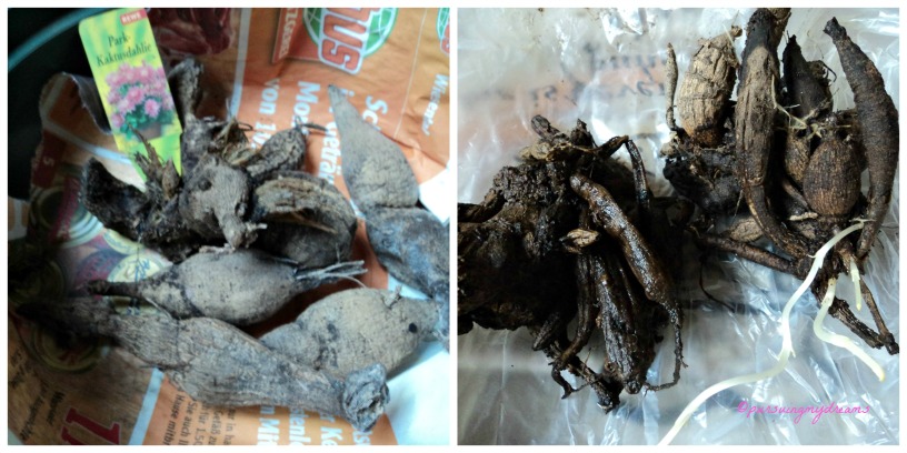Sebagian besar umbi bibit (bulb) adalah dari tahun sebelumnya. Menjelang musim dingin, semua bunga musim panas saya bongkar, dan umbinya saya bersihkan, keringkan lalu simpan di gudang. Kini bibit-bibit bunga musim panas saya keluarkan kembali dan siap ditanam. Oh ya ada beberapa yang sudah mulai tumbuh loh, sepertinya umbi mengenal perubahan cuaca, masuk musim semi mulai tumbuh sendiri.