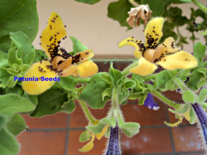 Kalau bunga-bunganya sudah kering, cabutin yang keringnya. Cabut bunganya dengan tangan. Nah biarkan bongkolnya pada tanamannya, karena bongkol bunganya ketika kering akan pecah, dan benih/biji Petunia akan keluar dengan sendirinya.