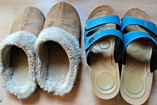 - Sendal rumah, kalau ada yang wol ya lebih bagus. Saya sih pakai sendal yang solnya agak tinggi, pemberian mama mertua. Punya sendal wol jarang dipakai, karena terbiasa pakai yang tinggi jadi merasa pendek pas pakai yang ceper. Pernah beli sendal rumah, bahan wol, tapi alasnya biji kapuk, jadi kalau jalan berisik. Suami komplain disuruh beli yang lain hehehe.