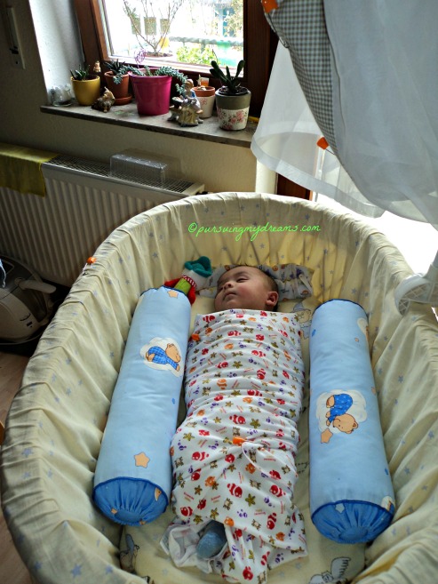 • Waktu tidur pulasnya jadi lebih lama, sudah sering tidur 3 sampai 4 jam, tapi kalau lagi “Bad day” nih anak akan rewel melulu, tidurnya tidak lama, setengah jam doang eh bangun, main-main, tidur lagi cuma setengah jam. Kata mama tidur begini seperti „tidur ayam“ sebentar-bentar bangun. • Tidur sudah tidak pakai ayunan (sarung) lagi, karena Ben mulai lasak ketika tidur. Miring ke kanan dan kiri, ayunan jadi goyang-goyang, saya yang kuatir dia jatuh. Ayunan dari sarung berguna banget dipakai sejak baru lahir hingga usia Ben hampir 2 bulan. Mama saya yang buatin karena mama bingung si Ben susah sekali tidurnya saat itu. Setiap di taruh diboksnya langsung bangun. Ketika di taruh ayunan bisa lama tidurnya, mungkin serasa digendong kali ya 😉 .