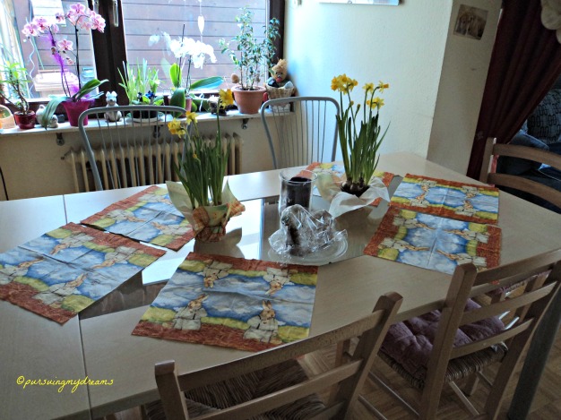 Paskah di Jerman. Biasanya Paskah identik dengan musim semi, cuaca cerah dan hangat. Tahun ini luar biasa, di hari paskah (minggu) ternyata salju masih turun, ya tipis sih. Cukup membuat menggigil karena suhu hanya diangka 5-7 derajat C dan anginnya kencang. Mungkin anak-anak tidak ada kegiatan mencari telur dialam deh, karena cuaca tidak bersahabat. Bisa-bisa anak-anak malah sakit.