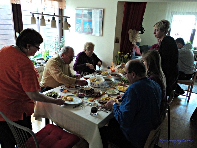 - Hari Paskah kami berkumpul di rumah mertua. Mama mertuaku mengundang orangtuanya dan dua saudarannya. Jam 6.30 saya sudah sampai rumah mertuaku untuk bantu-bantu masak. Kami mulai masak jam 7.30 baru kelar hampir jam 12.