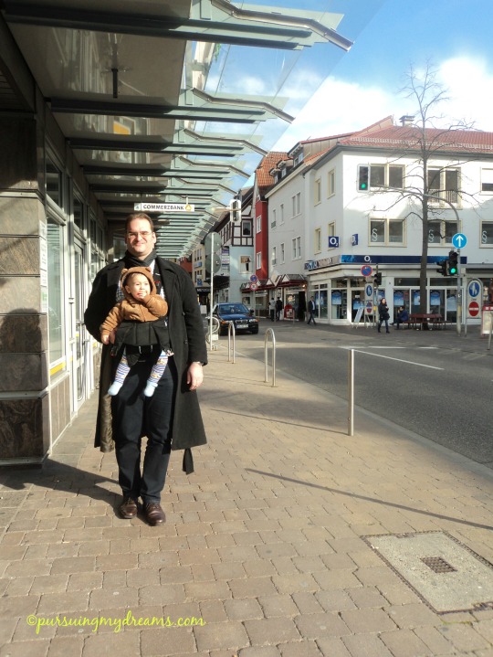 Babenya Ben kehilangan dompet isi ktp (personalausweis), kartu bulanan naik kereta dan sim. Dompetnya hanya isi 3 kartu tersebut, dompet duit beda lagi. Dompet kartu ditaruh di kantong jaket. Kalau dini hari di tempat kami masih dingin sekali kadang minus, siang hingga sore hangat bisa hampir 20 derajat c. Jadi kalau pergi kerja babenya Ben pakai jaket winter (foto atas pas gendong Ben) pas pulang jaket lipat dua taruh dilengan, jatuh deh tuh dompet. Sadar kehilangan pas di stasiun kereta kota tempat tinggal kami. Entahlah hilang di jalan tempat kerjaan, atau di kereta api, atau di Heidelberg pas pindah kereta.