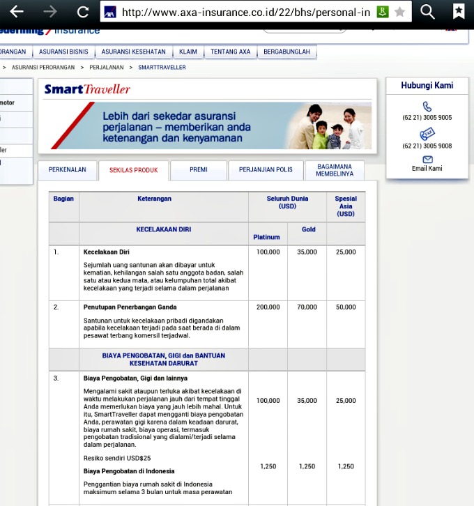 Beli langsung dikantor asuransinya bisa juga, misal untuk AXA silakan di http://www.axa-insurance.co.id/22/bhs/Personal-Insurance/Travel/SmartTraveller ada no telp atau email yang bisa dihubungi. Dibagian akhir tulisan ini saya sertakan juga nama-nama kantor asuransi yang bisa kamu tuju.