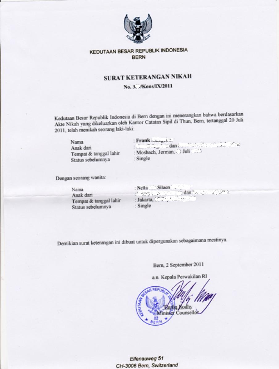 Saat ini saya menetap di Jerman, namun karena saya melaksanakan pernikahannya di Switzerland, maka saya harus lapor dan minta surat keterangan (pengantar) dari Switzerland juga.