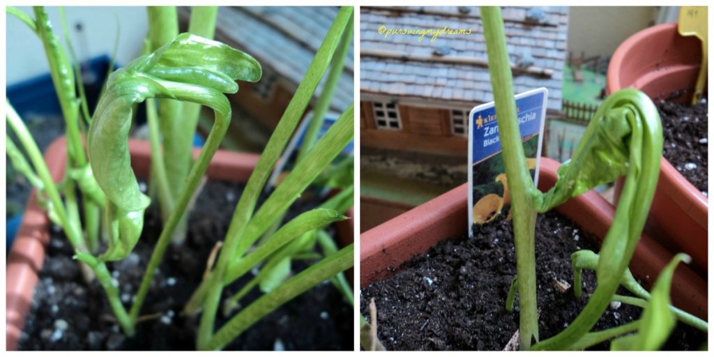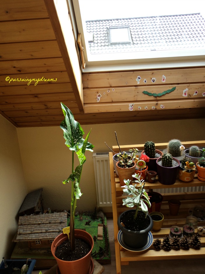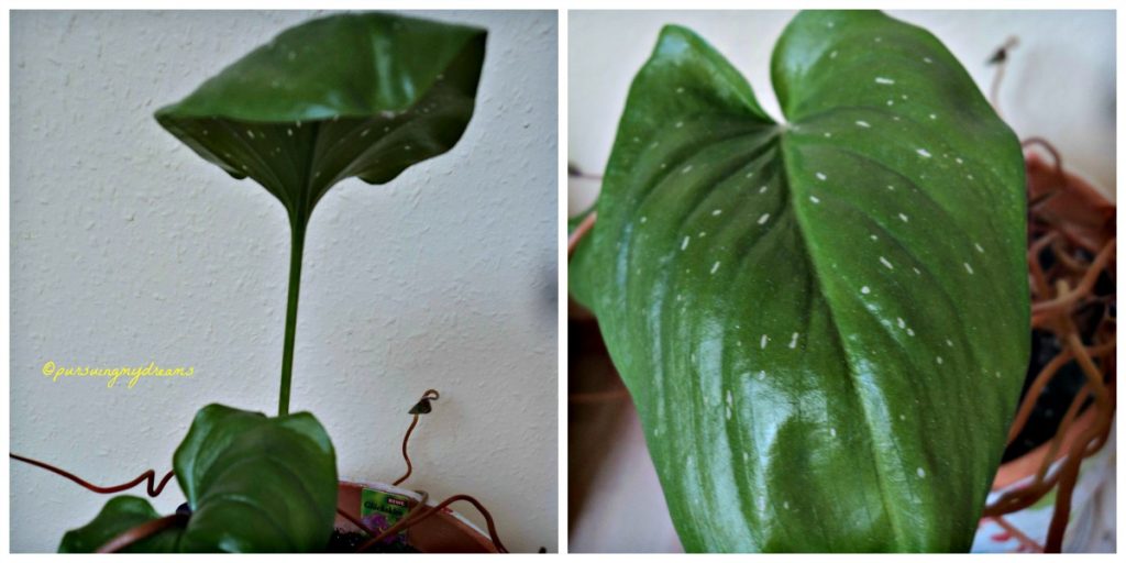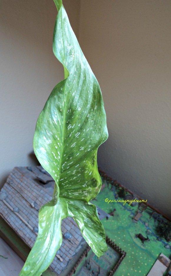 Bunganya belum muncul, mungkin 1-2 bulan lagi. Daun-daunya saja sudah sudah mulai banyak bermunculan dan mulai membuka. Daun-daunnya unik deh, daunnya berbentuk gulungan, menempel pada batang di depannya, perlahan akan menarik dan gulungannya akan membuka sempurna. Daun-daunnya berintik-bintik putih, kalau diperhatikan lebih dekat bintik putihnya transparan. Jadi seperti kehilangan pigmen makanya bercak-bercak putih :cool:.