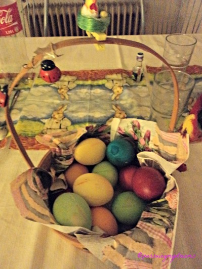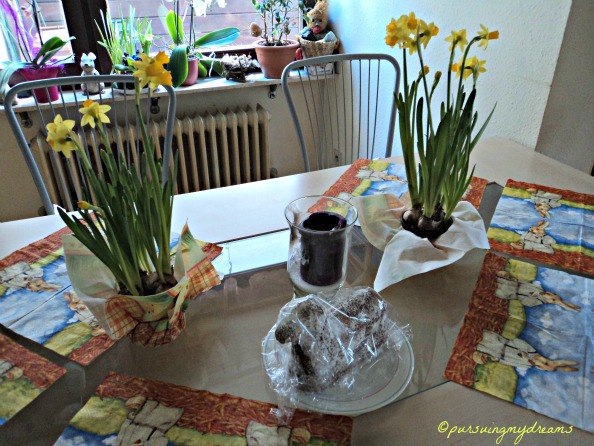 Paskah di Jerman. Biasanya Paskah identik dengan musim semi, cuaca cerah dan hangat. Tahun ini luar biasa, di hari paskah (minggu) ternyata salju masih turun, ya tipis sih. Cukup membuat menggigil karena suhu hanya diangka 5-7 derajat C dan anginnya kencang. Mungkin anak-anak tidak ada kegiatan mencari telur dialam deh, karena cuaca tidak bersahabat. Bisa-bisa anak-anak malah sakit.