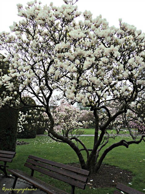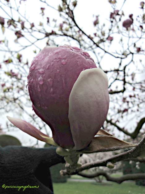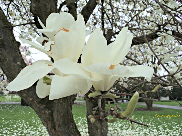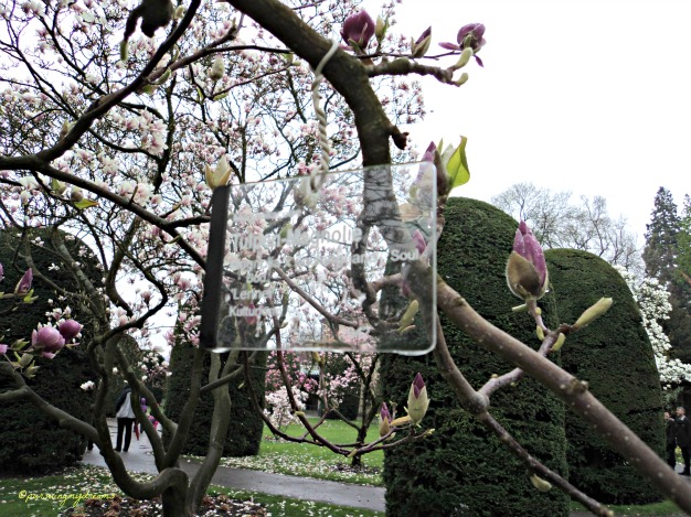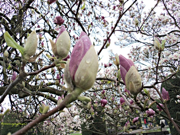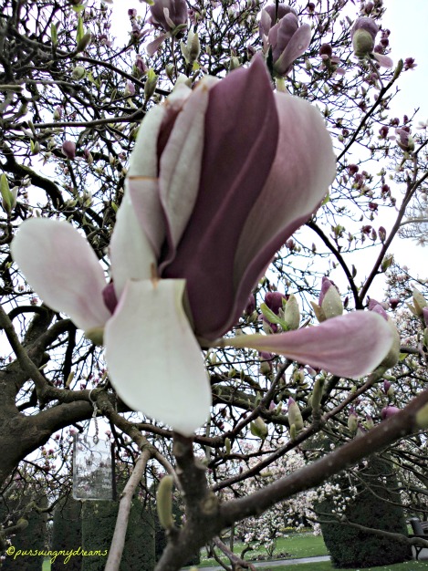 Magnolia Soulangeana (saucer magnolia) adalah tanaman hibrida keluarga Magnoliaceae. Bunganya muncul (bermekaran) ketika musim semi dengan berbagai nuansa putih, pink, dan ungu. Setelah bunganya rontok, baru akan muncul daun-daunnya, unik ya, selama ini saya tahunya daun-daun yang lebih dahulu bermunculan, baru bunganya, lah pohon ini malah kebalikannya :grin:.