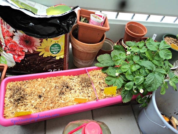 Pot stroberi sudah saya bungkus supaya tidak mati saat musim dingin