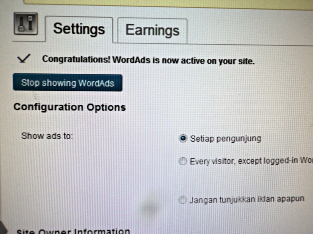 Ada salah satu komentar yang saya baca di tulisan peluncuran WordAds, jadi orang ini sudah dua minggu daftar tapi belum mendapat konfirmasi juga. Sedangkan saya, dalam waktu sehari langsung dapat konfirmasi. “Thanks for applying to WordAds for your WordPress.com site! You’re part of an exclusive group of sites that have been approved into the WordAds Beta.WordAds is now live on your site”. 😉