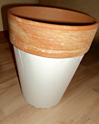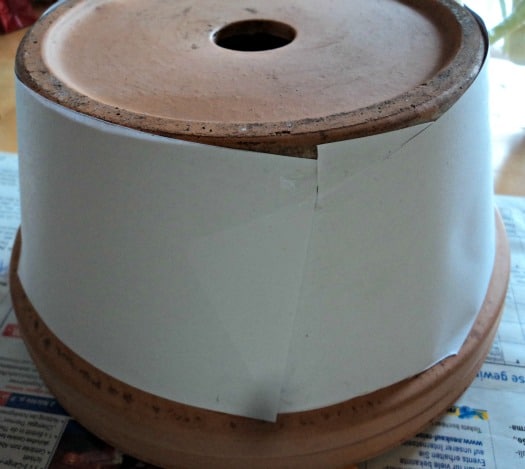 Media untuk napkin technique ini sebaiknya berwarna (latar belakang) putih, supaya serbet yang akan ditempel terlihat lebih menonjol. Kalau kamu punya cat berwarna putih, maka cat dulu pot bunganya, tunggu hingga kering. Berhubung saya tidak punya cat, dan kalau beli keluar uang dong!, maka saya gunakan kertas HVS untuk membuat latar belakang putih. Kalau saya lihat di pinterest banyak yang melapisi langsung pot terakotanya. Silakan kamu coba ya, kalau saya mikir ko bakalan keliatan warna pot terakotanya juga kalau tidak di cat putih dulu.