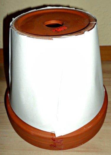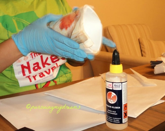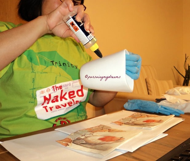 5.Setelah Pot tertutup dengan serbetnya, maka serbetnya kita lumuri lagi dengan lem, kalau bisa semua bagian. Karena serbet basah dengan lem hati-hati pengerjaannya jangan sampai serbetnya robek!.