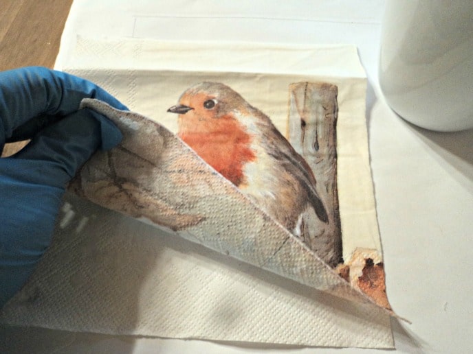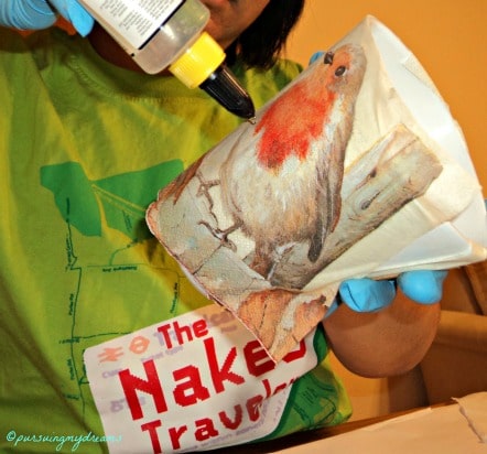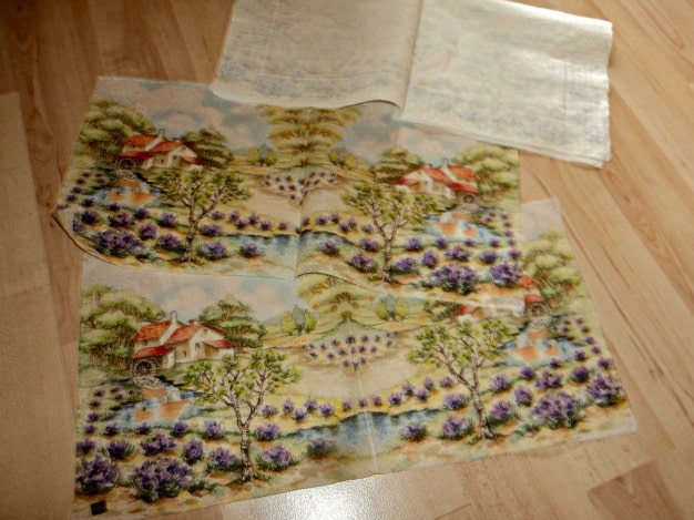 Mengapa lapisan bawah serbet harus dibuang? Karena kalau terlalu tebal sulit menempelnya, kalau nantinya terlalu ditekan bisa robek. Maka cukup gunakan lapisan bermotifnya saja.