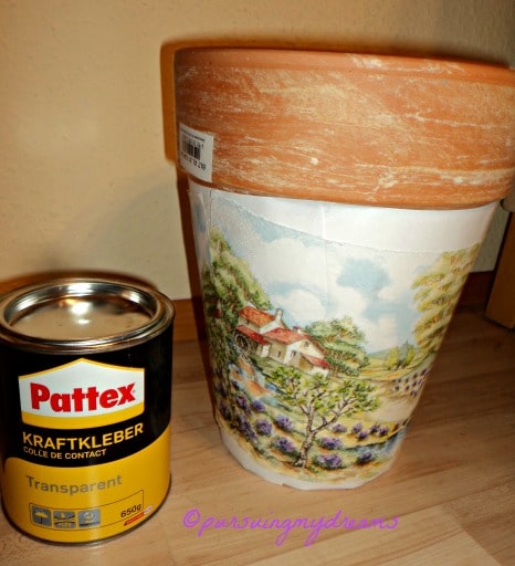 4.Buka lapisan bawah serbet, tempelkan serbet yang bermotif ke bagian luar pot. Atur sedemikian rupa, hingga semua bagian luar pot tertutupi dengan serbet. *Hiks pot kedua saya lupa membuang lapisan serbetnya, jadi terlalu tebal deh! 🙁 .