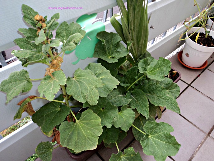 Makin tambah besar tanamannya. Saya menanam dari benihnya. Kalau tahun lalu beli jadi tanamannya yang masih kecil (karena bibit/biji kemasan mahal bangett padahal cuma pengen nanam 1 biji 😛 ). Setelah dipanen saya kumpulkan bijinya, dan ditanam musim semi yang lalu. Tumbuh 3 buah. Nah saya lupaaaa taruh dimana sisa biji terongnya.